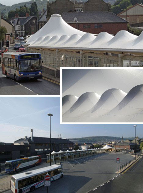 Sometimes all it takes to give an old structure new life is a snazzy new roof. Such is the case in the town of Pontypridd, Rhondda, Wales. The local municipal council asked architects Base Structures Ltd. to “design and install a bus station canopy which would provide shelter for the public and to make visiting the station a pleasant experience.” It appears they succeeded admirably.